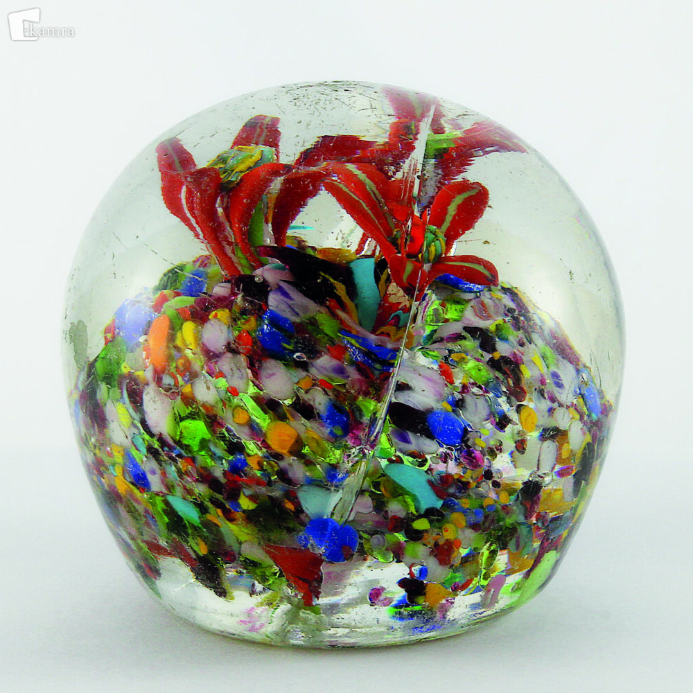 Rogaška Slatina?(1927 – 1940). Kroglast obtežilnik s tremi slabo izdelanimi večlistnimi cvetovi rdeče barve z rumenimi črtami, ki imajo v središču deformirane rumeno-zelene prašnike. Ob pecljih so cvetni listi globoko upognjeni proti pisani podlagi v obliki visokega hribčka. Obtežilnik ima veliko prečno razpoko, ki je nastala zaradi napetosti ob nepravilnem ohlajanju. Baza je površno zbrušena, z vidnim odtisom odloma od steklarske palice. V = 73 mm, Š = 78 mm.