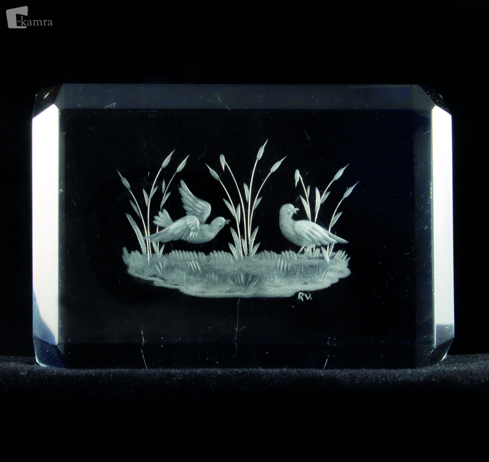 Slovenija (pred letom 1940). Nizek pravokoten obtežilnik s široko zbrušenimi robovi in posnetimi vogali. Na spodnji ravni ploskvi je vgraviran motiv dveh ptic med rogozom v močvirju. Pod motivom je vgravirana drobna signatura RV. V = 20 mm, D = 109, Š = 74 mm.