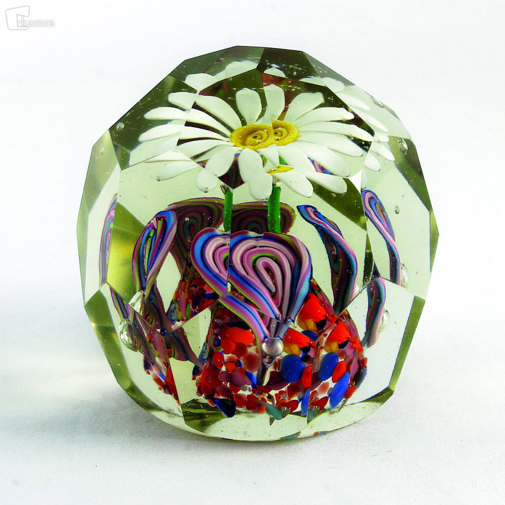 Češka ali Nemčija (1950 – 1960). Obtežilnik iz rahlo rjavkasto toniranega stekla s štirimi nivoji fasetnih polj. Glavni motiv predstavlja velik bel, marjetici podoben cvet z rumenim cvetnim jedrom. Pecelj je zelen in sega v visoko ozko podlago iz pisanih delcev pretežno oranžnega in modrega stekla. Štirje stranski cvetovi so iz ploščic polžasto zvitih barvnih trakov, ki so na zunanji strani razpotegnjene ob ekscentrično postavljenih mehurčkih v obliki njihovih pecljev. Baza je ravna in polirana, njen rob je zaokrožen. V = 78 mm, Š = 78 mm.