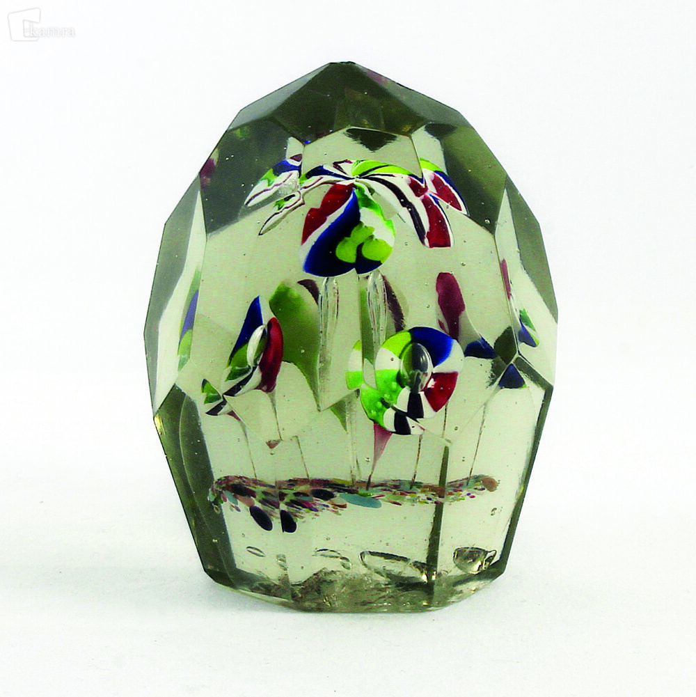 Obtežilnik iz rahlo zelenkastega stekla s štirimi nivoji fasetnih polj