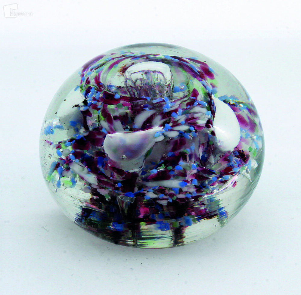 Zasavje (pred letom 1939). Obtežilnik nižje kroglaste oblike s petimi mehurčki, od katerih sta dva zamegljena in rahlo razpotegnjena v smeri vrtenja med izdelavo. Stekleni drobci bele, rdeče, modre in zelene barve so vključno z blazino v štirih nivojih. V najvišjem nivoju so nataljeni in razpotegnjeni v smeri vrtenja. Baza je ravna in polirana. V = 65 mm, Š = 82 mm.
