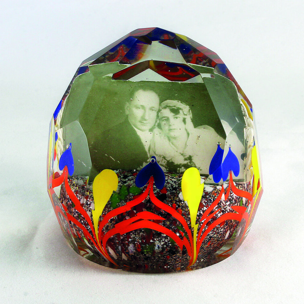 Obtežilnik s fotografijo zakonskega para, ki je bila aplicirana s posebno tehniko na keramično ploščico postavljeno na podlago v obliki blazine iz raznobarvnega steklenega drobirja in svetlečih drobcev sljude. Blazino obkrožajo ozki obokani oranžni trakovi in drugi okrasni elementi. Obtežilnik ima pet nivojev fasetnih polj z velikim oglednim oknom pred fotografijo. Baza je polirana. V = 92 mm, Š = 92 mm