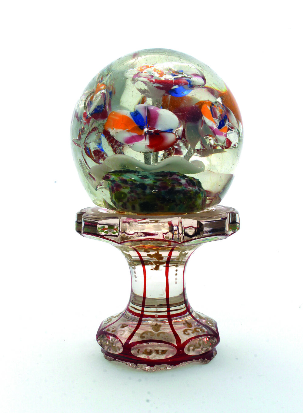 Obtežilnik v obliki bidermajerskega poročnega šopka je bil izdelan v steklarni Novi Benediktov dol pri Rušah pred letom 1892. Glavni motiv v zgornjem kroglastem delu obtežilnika predstavlja pet enako velikih čašastih cvetov iz belega, rdečega, modrega in rumenega prelivajočega stekla. Ekspandirani mehurčki so iz sredine cvetov podaljšani v peclje do valovite podlage iz belega opalnega stekla, ki leži na blazini iz drobcev pisanega steklenega drobirja. Podstavek obtežilnika je razčlenjen in razdeljen z rdečimi črtami na osem polj, z naslikanimi vinjetami in cvetnimi motivi. Celotna višina = 170 mm, višina kroglastega dela = 94 mm, širina = 100 mm.