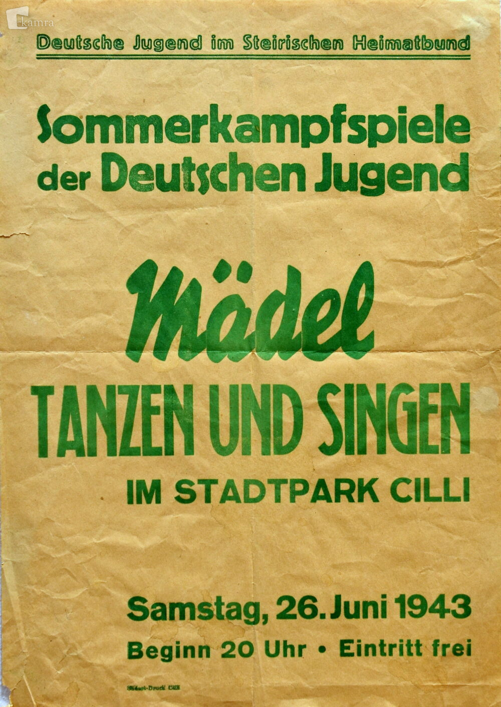 Plakat: Mädel tanzen und singen im Stadtpark Cilli Elemento multimediale 28.01.2026 12:49 pubblicato da Osrednja knjižnica Celje Mädel tanzen und singen im Stadtpark Cilli : 26. Juni 1943, tisk Süd – Ost Druck, 1943, Cilli. 43 x 30 cm. Slika FacebookXPinterestLinkedIn Natisni Natisni brez slik
