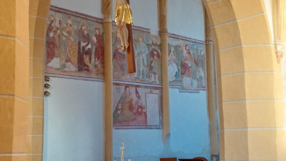 Vzdolž severne stene prezbiterija poteka niz štirih polj. V njih se zvrstijo stoječi, markantni svetniki z atributi, Marija z detetom na prestolu in sv. Krištof z malim Jezusom. V srednjem, četrtem polju je donatorska podoba Janeza Heriča skupaj z malo hčerko Katarino.