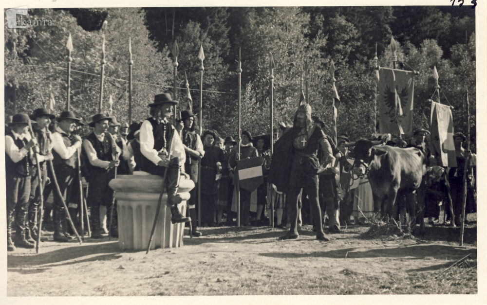 Septembra 1935 je bila ob 15. obletnici plebiscita Poljana na Prevaljah prizorišče znamenitega ‘Poljanskega tabora’ in uprizoritve slavnostne ljudske igre v petih dejanjih ‘Poslednje ustoličenje’. Igro je v spomin na poslednje ustoličenje koroških vojvod (13. marca 1414) dramatiziral France Brenk. Uprizoritev na Poljani, v neposredni bližini avstrijske meje, je bila za tisti čas svojevrstna politična provokacija. Foto Josip Pelikan