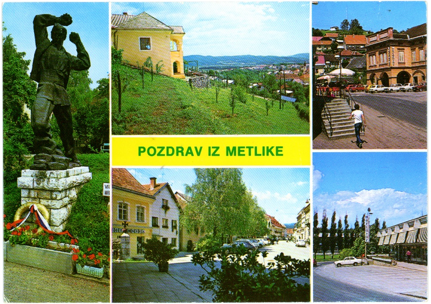 Razglednica s petimi motivi Metlike. Levo partizan, ki meče bombe, sredina zgoraj gostišče na Veselici, ki je v zasebni lasti, s pogledom na Metliko, sredina spodaj pogled od farne cerkve sv. Nikolaja proti Mestnemu trgu, desno zgoraj stopnišče metliškega hotela, pogled na Mercatorjevo trgovino pohištva (danes Mladinski center), desno spodaj stara samopostrežna trgovina v bližini semaforiziranega križišča (danes prazna). Razglednica je bila 30. 9. 1987 poslana v  Maribor. Založnik Fotolik Celje, foto Z. Vidmar, M. Gorjanc.