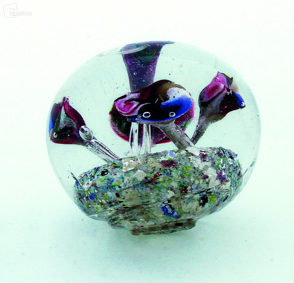 Pohorje (okoli leta 1860). Primer nedokončanega kroglastega obtežilnika s petimi majhnimi deformiranimi cvetovi iz raznobarvnega stekla. Drobni mehurčki iz njihove sredine se nadaljujejo v deformirane navzkrižno postavljene cvetne peclje. Le – ti segajo do podlage v obliki nizke skodelice iz raznobarvnih steklenih drobcev in prevladujočih lističev sljude. Spodnji del obtežilnika ni obdelan, z jasno vidnim odlomom od steklarske palice. V = 67 mm, Š = 76 mm.