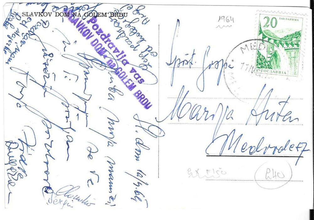 Slavkov dom na Golem Brdu Elemento multimediale 10.12.2025 09:34 pubblicato da Knjižnica Medvode Na razglednici je Slavkov dom na Golem Brdu, pred njim sta levo in desno parkirana dva avtomobila – fička. Razglednica je bila poslana v Medvode, kjer takrat še niso imeli uličnega sistema. Slika Hrbtna stran FacebookXPinterestLinkedIn Natisni Natisni brez slik