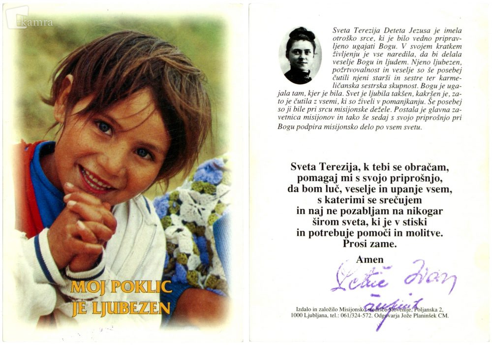 Sv. Terezija Deteta Jezusa Elemento multimediale 30.12.2023 10:13 pubblicato da Knjižnica Jožeta Udoviča Cerknica Sv. Terezija Deteta Jezusa in deklica v molitvi. Ljubljana: Misijonsko središče Slovenije. Mere: 8,5 x 12 cm. Zasebna zbirka družine Kranjec iz Topola pri Begunjah. Slika FacebookXPinterestLinkedIn Natisni Natisni brez slik