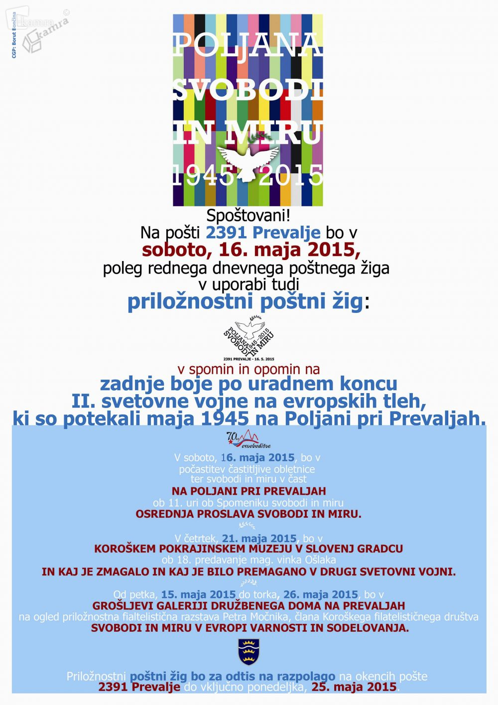 Obvestilo pošte o uporabi priložnostnega poštnega žiga ob 70. obletnici zadnjih bojev 2. svetovne vojne na Poljani pri Prevaljah.