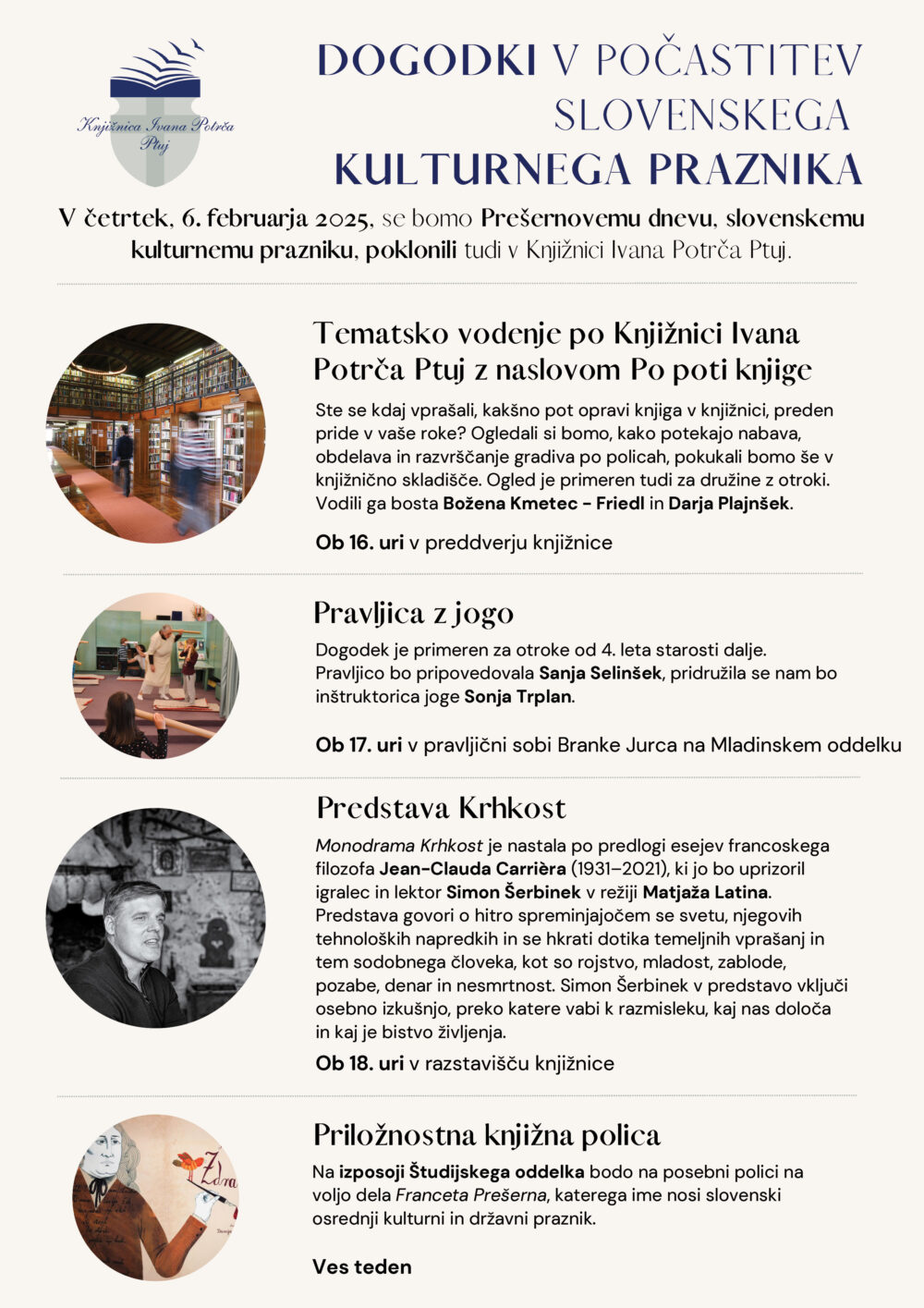 V ptujski knjižnici ob kulturnem prazniku Elemento multimediale 24.01.2025 11:16 pubblicato da Knjižnica Ivana Potrča Ptuj Slika FacebookXPinterestLinkedIn Natisni Natisni brez slik