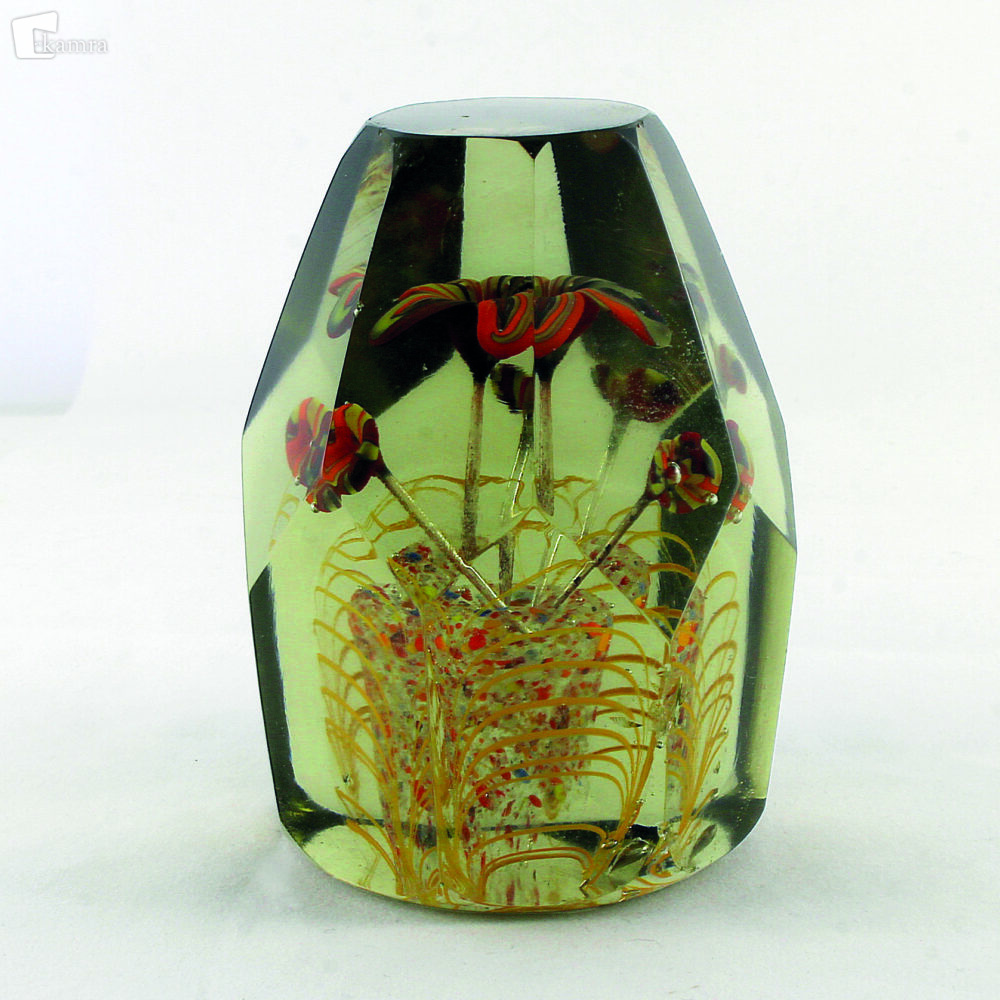 Češka (1920 – 1939). Visok fasetiran obtežilnik iz rjavkastega dimljenega stekla. Fasetna polja so v treh nivojih, od katerih je zgornje polje v obliki osemkotnega oglednega okna. Osrednji petlistni cvet je iz stekla oranžne, rdeče in rumene barve. Enake barve so tudi trije manjši čašasti cvetovi okoli njega. Peclji so v obliki tankih in enakomerno širokih mehurčkov. Podlaga s prevladujočimi oranžnimi drobci stekla je oblikovana kot majhen cvetlični lonček. Obkrožajo jo zelo tanke oranžne steklene niti razporejene v štirih visokih lokih. Baza je ravna in polirana, njen rob je zaokrožen. V = 110 mm, Š = 86 mm.