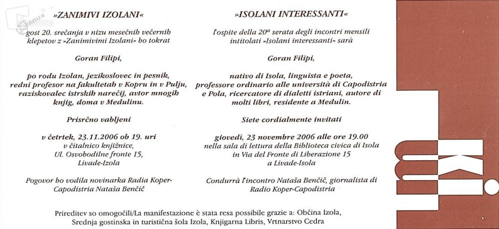 Isolani interessanti - Goran Filipi, invito Elemento multimediale 16.08.2012 09:59 pubblicato da Mestna knjižnica Izola L’ospite della 20° serata degli incontri mensili intitolati “Isolani interessanti” è stato Goran Filipi. Slika Hrbtna stran FacebookXPinterestLinkedIn Natisni Natisni brez slik
