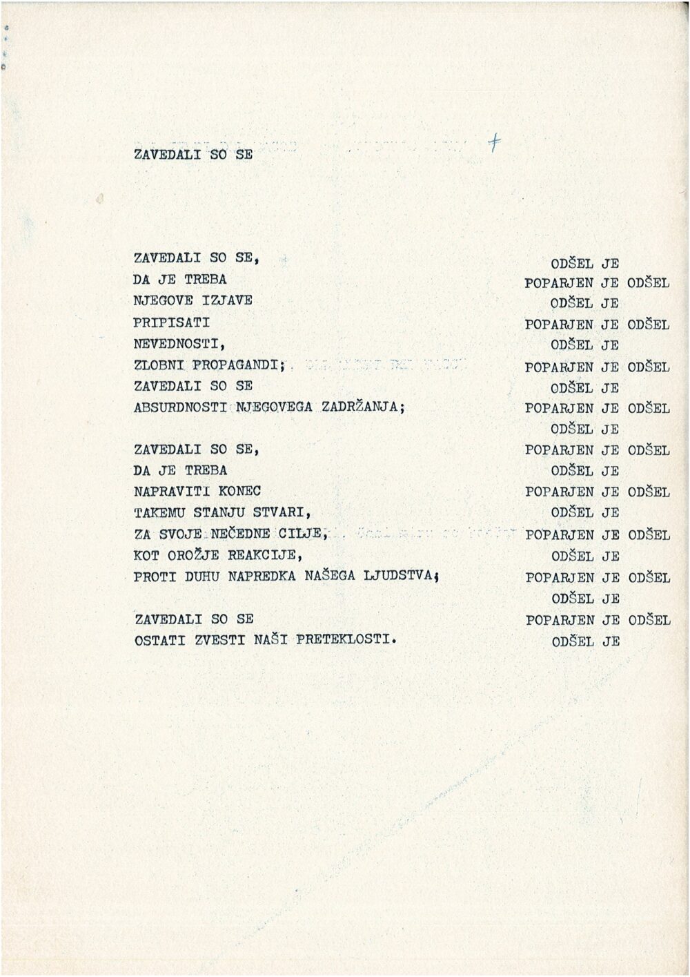 Zavedali so se, da je treba njegove izjave pripisati nevednosti, zlobni propagandi; zavedali so se absurdnosti njegovega zadržanja; zavedali so se, da je treba napraviti konec takemu stanju stvari, za svoje nečedne cilje, kot orožje reakcije, proti duhu napredka našega ljudstva; zavedali so se ostati zvesti naši preteklosti.