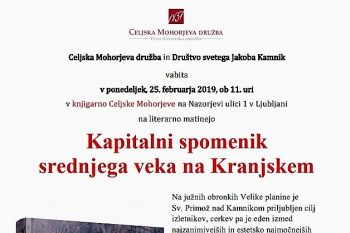 Celjska Mohorjeva družba in Društvo svetega Jakoba Kamnik vabita v ponedeljek, 25. februarja 2019, ob 11. uri v knjigarno Celjske Mohorjeve na Nazorjevi ulici 1 v Ljubljani na literarno matinejo Kapitalni spomenik srednjega veka na Kranjskem.