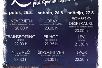 Sosednji prijatelji Kidričevo vas od petka, 25. 8. 2017, do nedelje, 27. 8. 2017, vabijo v kino pod zvezdami. Na ogled bo vrsto odličnih filmov, ki se bodo predvajali pred Športno dvorano Kidričevo, skratka pod zvezdami.