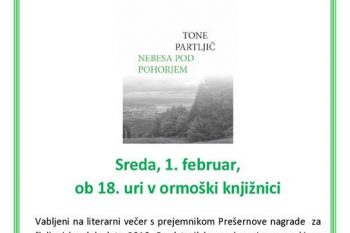 Knjižnica Franca Ksavra Meška Ormož vas v sredo, 1. febrauarja 2017, ob 18. uri vabi na literarni večer s Tonetom Partljičem, prejemnikom Prešernove nagrade 2016 za življensko delo.