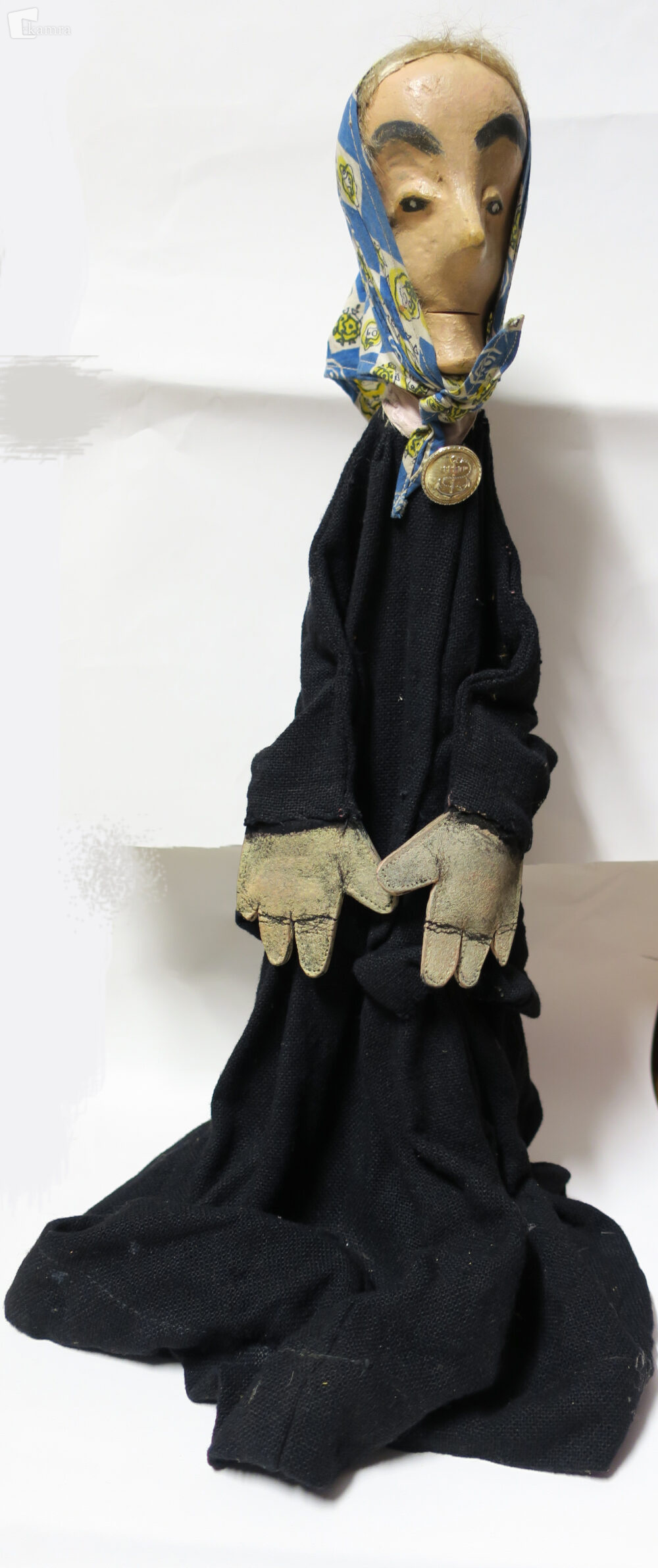 Lesena ročna lutka. Lik predstavlja starejšo gospo z naglavno ruto z rumeno-modro-belimi vzorci. Obraz je ozek in podolgovat, ima majhne podolgovate oči, zašiljen nos, tanke ustnice in izstopajočo brado. Ima svetle človeške lase. Nosi črno obleko z manšetnim gumbom na vratu. Obleko je zašila Štefanija Pandurovič. Lutka stoji na lesenem stojalu.
