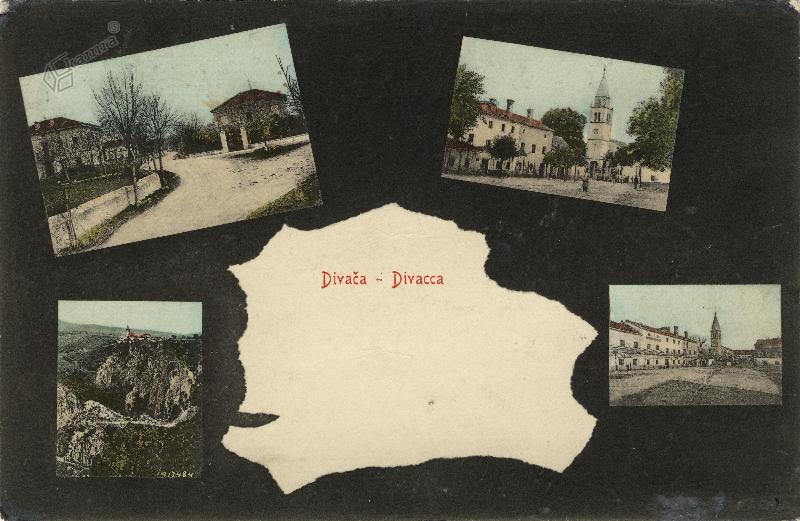 Razglednico, natisnjeno na črni podlagi, sestavljajo štiri sličice in veliko središčno belo polje, v katerem je natisnjen naslov razglednice. Hotel Central (današnji Risnik) in vila Lina (danes pošta) sta zgoraj levo, glavni trg z Obersnelovo hišo in cerkvijo sv. Antona puščacnika, pred katero je množica ljudi, pa zgoraj desno. Spodaj levo je panoramski pogled na Škocjan in ponovno pogled na glavni divaški trg na desni strani.