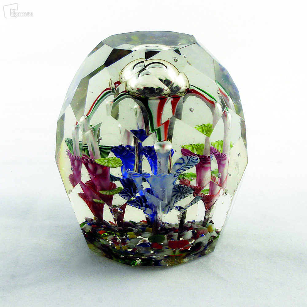 Češka (1910 – 1930). Jajčasto oblikovan obtežilnik s petimi nivoji fasetnih polj, od katerih je zgornje horizontalno polje v obliki manjšega devetkotnega oglednega okna. Notranja dekoracija je natančno izdelana in sestoji iz osrednjega cveta z velikim ekspandiranim mehurčkom, ki sega navzdol do središča pisane blazine. Štirje cvetni listi so iz zlitih trakov zelene, bele in oranžne barve. Na koncih se dotikajo podolgovatih mehurčkov, ki segajo v središča štirih obrobnih čašastih cvetov iz raznobarvnih pletenic v dveh nivojih. Devetkotna baza je ravna, polirana. V = 85 mm, Š = 77 mm.