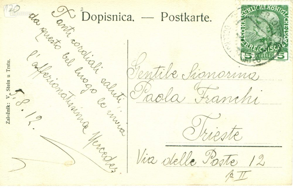 Ena starejših razglednic, ki prikazuje Brusovo blagovnico. V ozadju je še videti vrt, ki so ga pozneje pozidali. Na levi je vidna tudi Smoletova hiša, ki so jo pozneje porušili.