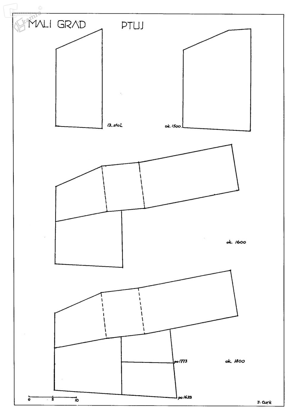 Na sliki: Curkova skica gradbenega razvoja Malega gradu v času od 13. do 19. stoletja.