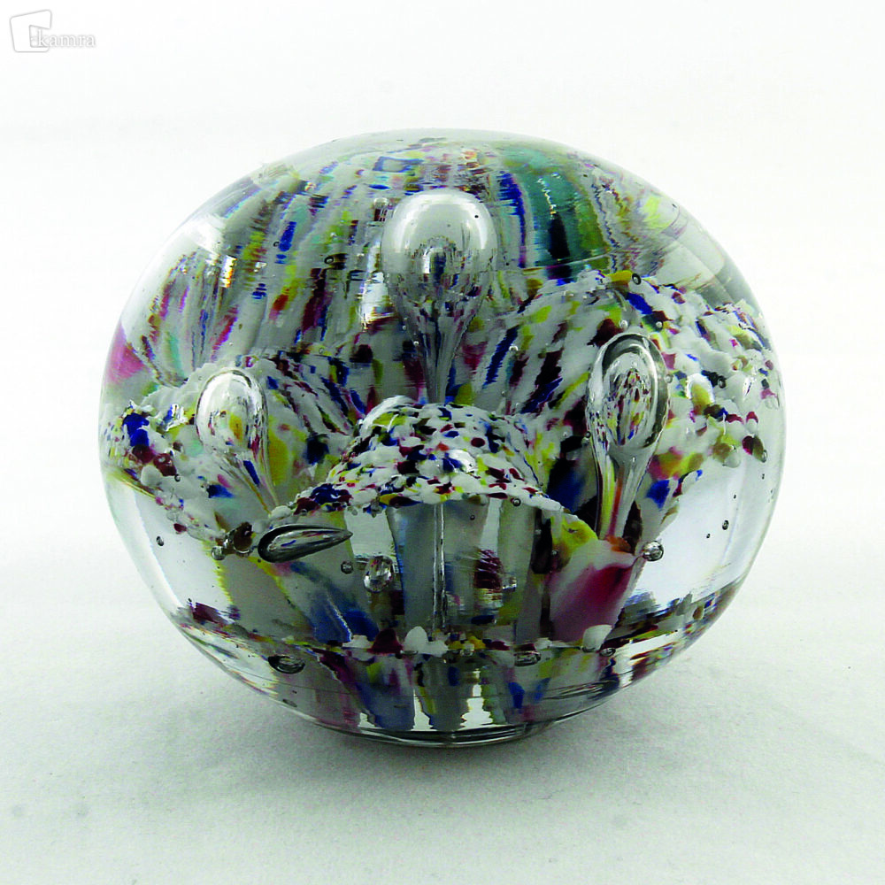 Fancija ali Belgija (1880 – 1920). Kroglast horizontalno ovalen obtežilnik samo z dvema nivojema, sestavljenima iz belih, modrih, rdečih in rumenih steklenih delcev. Sredinski mehurček in štirje obrobni potekajo v sredini širokih lijakastih vdolbin vse do baze obtežilnika. To daje notranjosti obtežilnika valovito razgiban videz. Veliki ekspandirani mehurčki imajo izrazit srebrn lesk. Na površini obtežilnika so vidne rahle koncentrične sledi vrtenja objekta v zaključni fazi izdelave. Baza je zelo majhna in slabo obrušena. V = 68 mm, Š = 82 mm.