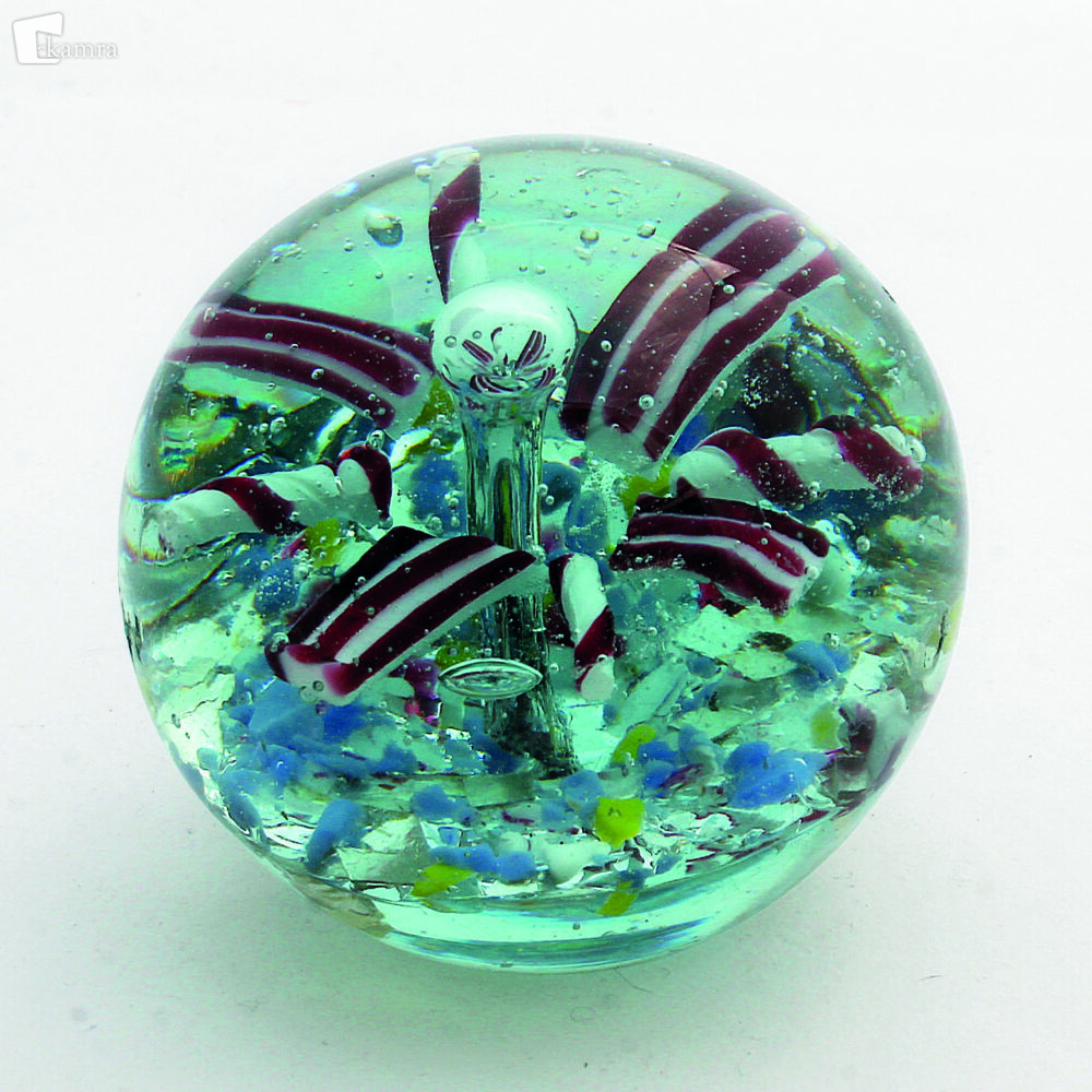 Pohorje (1870 – 1900). Kroglast obtežilnik iz rahlo modrikasto obarvanega stekla. En sam centralno nameščen cvet je izdelan iz štirih ploščatih in štirih zavitih rdeče-belih steklenih trakov, ki ponazarjajo cvetne liste. Visok osrednji mehurček se podaljšuje v debel cvetni pecelj. Blazina je iz različno debelih neenakomerno razporejenih drobcev raznobarvnega stekla. Vmes so veliki srebrni svetleči lističi, ki bi lahko bili iz sljude. Baza obtežilnika je ravna in brušena. V = 63 mm, Š = 73 mm.