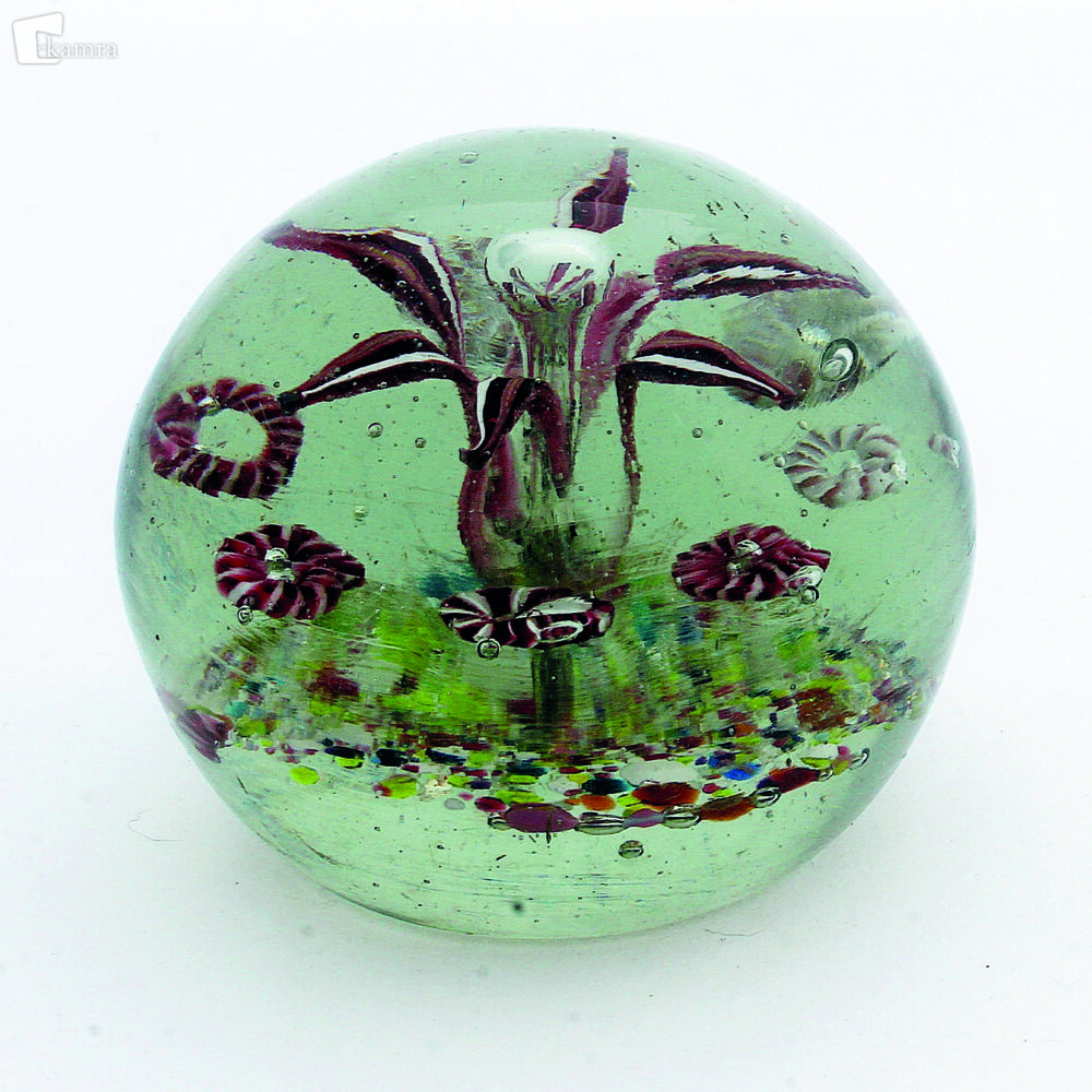 Pohorje (pred 1909). Kroglast obtežilnik iz rahlo rjavkasto obarvanega stekla z osrednjim čašastim cvetom s tankimi rahlo zavitimi cvetnimi listi. Ekspandiran mehurček v osrednjem delu predstavlja velik cvetni pestič ob katerem so cvetni listi upognjeni proti podlagi v obliki rahlo vbočene blazine. Okoli osrednjega cvetnega motiva je razporejenih šest manjših ploščic iz rdeče – belih polžasto zvitih pletenic. Blazina, ki je iz raznobarvnih neenakomerno porazdeljenih in različno velikih steklenih drobcev med katerimi so redki lističi sljude. Baza obtežilnika ni obdelana in ima jasno vidno mesto odloma od steklarske palice. V = 67 mm, Š = 78 mm.
