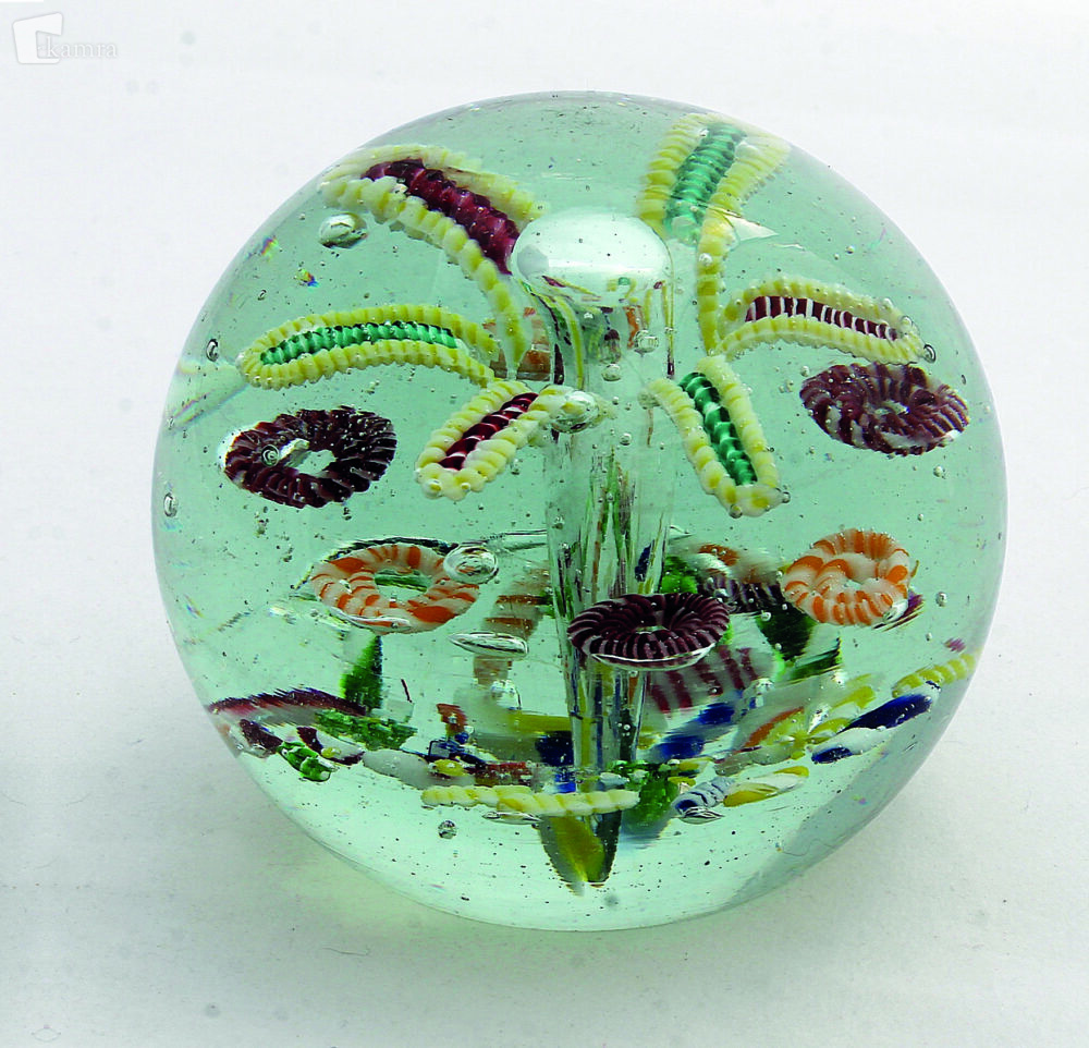 Steklarna Zagorje ob Savi (1870 – 1920). Kroglast obtežilnik iz rahlo zelenkasto obarvanega stekla. Osrednji motiv je cvet s šestimi cvetnimi listi iz tankih rdeče-belih in zeleno – belih pletenic, ki so obrobljeni z rumeno-belo pletenico. Osrednji mehurček je debel in sega do baze obtežilnika. Ob njem so cvetni listi rahlo upognjeni navzdol. V steklu pod cvetom lebdi šest spiralasto zvitih obročev izdelanih iz rdeče-belih in oranžno-belih pletenic. Blazina je iz poredko razmetanih ostankov raznobarvnih pletenic. Baza obtežilnika je ravna in polirana. V = 73 mm, Š = 85 mm.