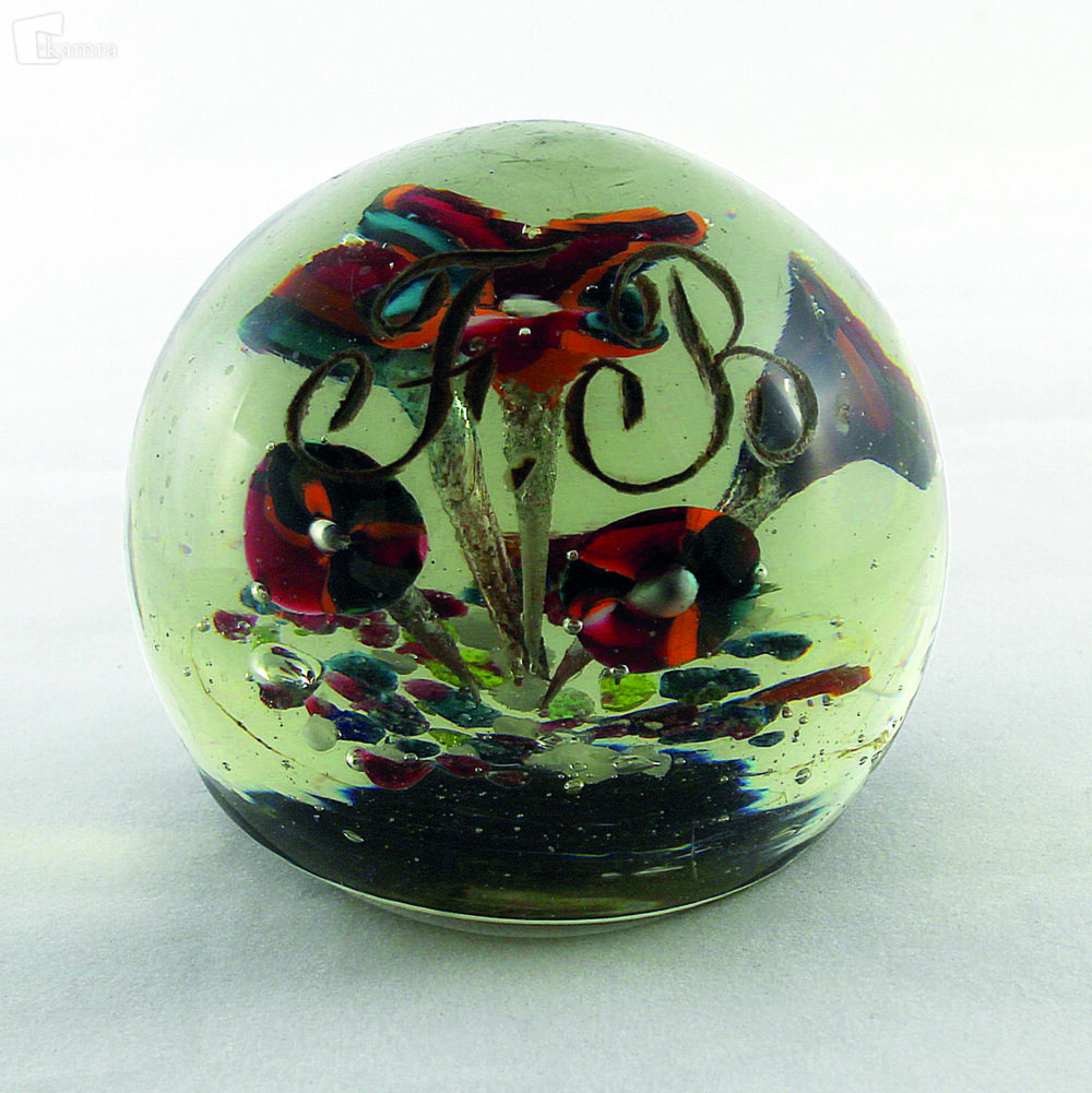 Kozjansko (okoli leta 1870). Kroglast obtežilnik iz zelenkasto rjavega stekla. Sredinski cvet s štirimi cvetnimi listi in štirje manjši čašasti cvetovi okoli njega so izdelani iz oranžnega, rdečega, črnega, belega in modrega stekla. Pestiče cvetov predstavljajo ekspandirani mehurčki podaljšani v cvetne peclje, ki se tik nad podlago blazine skoraj stikajo. Blazina je iz redko posejanih, različno velikih koščkov raznobarvnega stekla, med katerimi so tudi večji zračni mehurčki. Na površini obtežilnika je gravura F. B. Baza je površno zbrušena. V = 70 mm, Š = 83 mm.