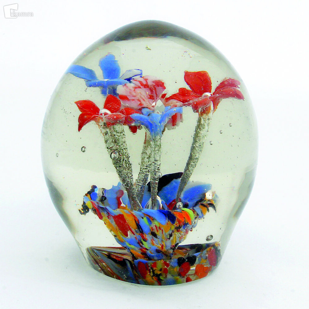 Pohorje? (1870 – 1909). Kroglast obtežilnik, ki je v spodnjem delu podaljšan v jajčasto obliko. Glavni motiv je sestavljen iz rdeče belega osrednjega cveta, ki ga obdajajta dva manjša rdeča in dva modra cvetova. Peclji, ki se nadaljujejo iz osrednjega dela cvetov do raznobarvne podlage v obliki cvetličnega lončka s podstavkom, imajo izrazit srebrn lesk. Baza je ravna in brušena. V = 89 mm, Š = 76 mm .