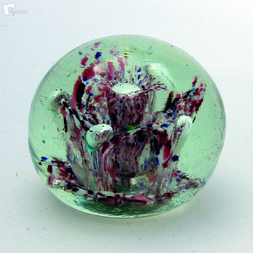Okolica Celja ali Zasavje (1870 – 1925). Kroglast obtežilnik s petimi mehurčki, ki so vse do blazine razmeroma široki. Ob njih so trije nivoji raznobarvnih delcev stekla močno lijakasto upognjeni navzdol, kar daje obtežilniku izrazito razgiban videz. Beli, modri in rdeči drobci ter steklen prah v treh nivojih in v blazini, imajo zaradi drobnih zračnih mehurčkov srebrn odblesk. Steklo je brezbarvno, na površini obtežilnika pa so vidni sledovi vrtenja v zaključni fazi izdelave. Baza je brušena in postavljena nekoliko izven osi obtežilnika. V = 70 mm, Š = 84 mm.