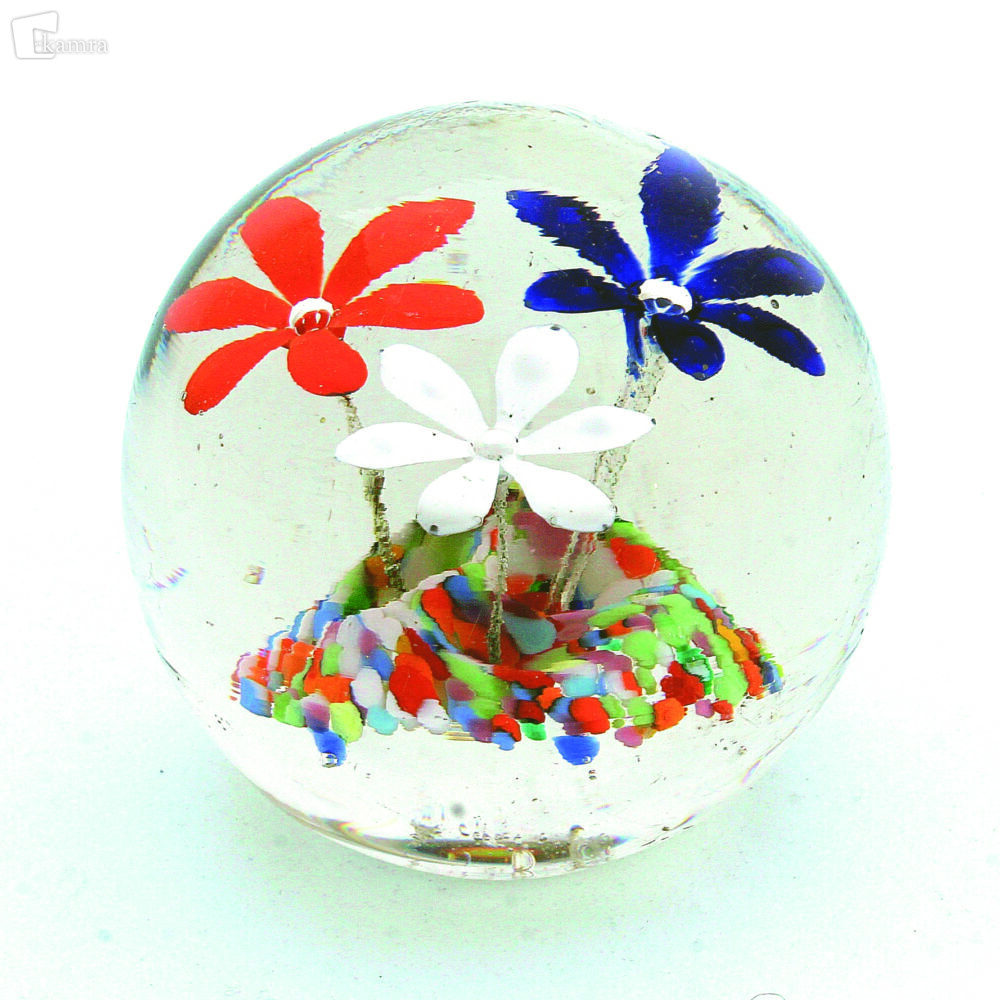 Kroglast obtežilnik s tremi šestlistnimi cvetovi rdeče, bele in modre barve