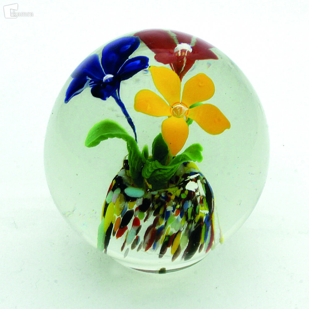 Hrastnik (1900 – 1940). Kroglast obtežilnik z nekoliko dvignjeno kupolo in zoženim spodnjim delom tik nad bazo. Trije petlistni cvetovi rdeče, modre in rumene barve z drobni mehurčki na mestu pestičev se navzdol nadaljujejo v tanke cvetne peclje v barvi cvetov. Podlaga cvetnega motiva je v obliki enostavnega cvetličnega lončka iz raznobarvnih steklenih delcev. Iz njega ob cvetnih pecljih izraščajo trije veliki zeleni listi. Na površini obtežilnika so vidne napake, ki so nastale pri finalizaciji zaključnega nanosa steklene mase. Ravna baza je ozka in polirana. V = 88 mm, Š = 80 mm.