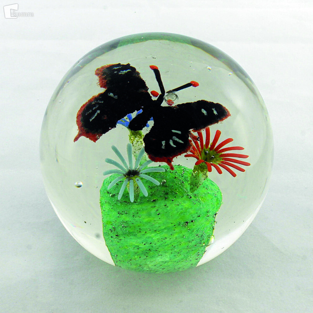 Nemčija (1920 – 1930). Kroglast obtežilnik z visoko dvignjeno podlago pokrito z zelenim steklenim prahom in tremi drobnimi cvetovi rdeče in modre barve na kratkih pecljih. Nad njimi lebdi metulj iz črnega stekla z rdečo obrobo. Baza je ravna, polirana. V = 80 mm, Š = 84 mm.