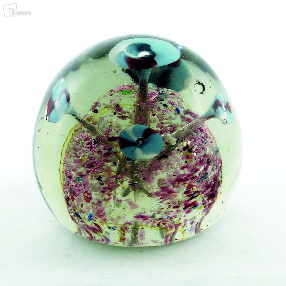 Pohorje? (po letu 1870). Kroglast primerek obtežilnika z rahlo povišano kupolo. Osnovni cvetni motiv sestavlja čašast sredinski cvet obkrožen s štirim manjšimi cvetovi iz prelivajočega modro-belo-rdeče obarvanega stekla. Posebnost obtežilnika je izjemno visoko dvignjena podlaga iz enako velikih in enakomerno razporejenih drobcev pisanega stekla in drobnih lističev sljude. Podlago, ki zapolnjuje večji del notranjosti obtežilnika skoraj do baze, prebadajo močni cvetni peclji. Baza obtežilnika je ravna in polirana. V = 77 mm, Š = 83 mm.