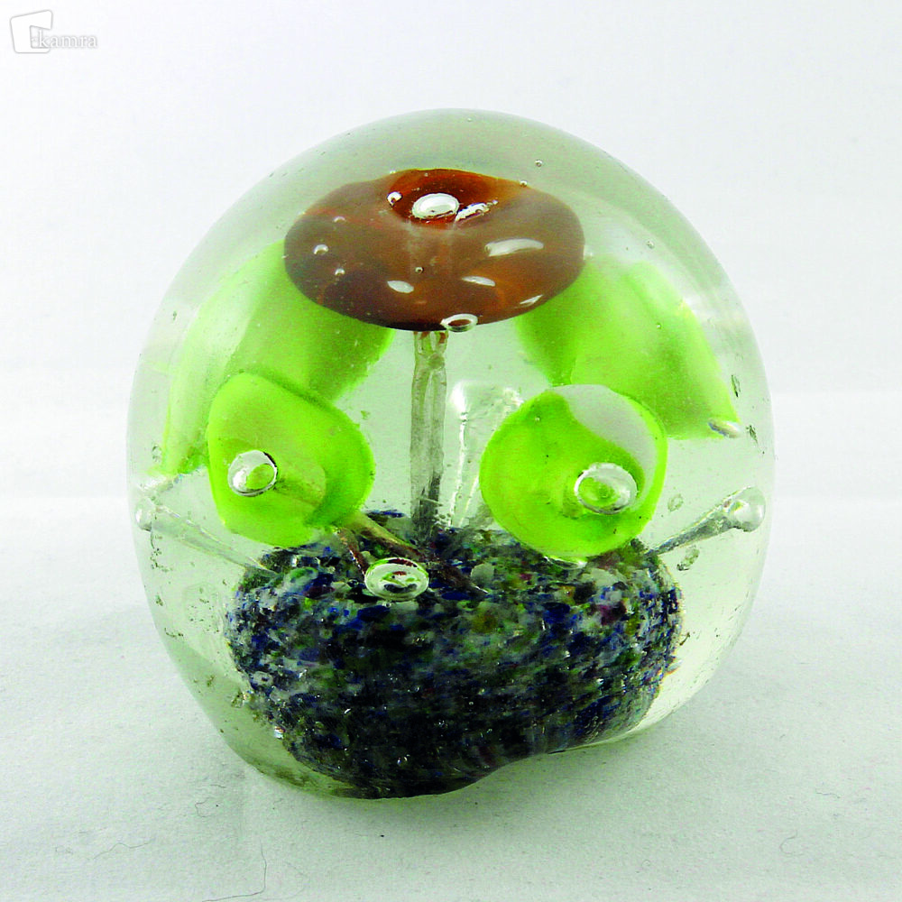 Rogaška Slatina? (1927 – 1944). Kroglast primerek obtežilnika z rahlo povišano kupolo. Cvetni motiv predstavlja čašast oranžen sredinski cvet, ki je obkrožen s štirim manjšimi rumenimi čašastimi cvetovi. Visoko nastavljeni mehurčki se iz sredine cvetov podaljšujejo v navzkrižno potekajoče cvetne peclje vse do nekoliko dvignjene podlage iz raznobarvnih steklenih drobcev. Notranjost obtežilnika je zaradi zamegljenega stekla slabo vidna. Baza, ki je grobo zbrušena in zaradi napake v zaključnem sloju stekla, ni povsem okrogla. V = 80 mm, Š = 82 mm.