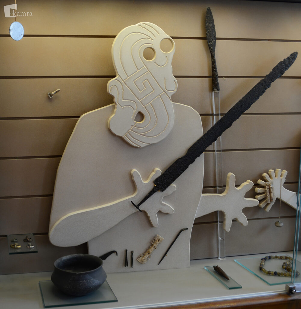 Del vitrine z germanskimi najdbami na arheološki razstavi Železna nit v Mestni hiši. Langobardi so na ozemlje današnje Slovenije prišli kot najemniški vojaki Bizantinskega cesarstva. Leta 568 so svoje ozemlje prepustili Slovanom in se preselili v Italijo. K opremi langobardskega vojščaka je sodil tudi dolg meč.