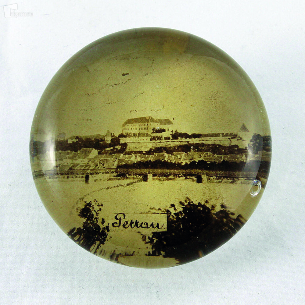 Slovenija (1900 – 1914). Lečasto oblikovan spominski obtežilnik mesta Ptuj z obledelo na kartonu natisnjeno rjavkasto fotografijo mestne vedute, s pogledom na Dravo in ptujski grad. Na spodnjem delu slike je napis Pettau, ki je nemško ime za Ptuj. V = 24 mm, Š = 67 mm.