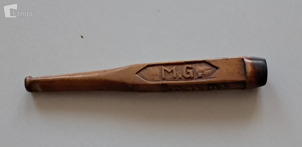Fotografiji prikazujeta lesen ustnik za cigarete ali “cigaret špic”, ki ga je Matija Glad izdelal v koncentracijskem taborišču na Rabu med leti 1942 in 1943. Dobro se vidijo izrezljani napisi M.G., SPOMIN, Z RABA in L. 1942-43 na vseh štirih straneh ustnika.