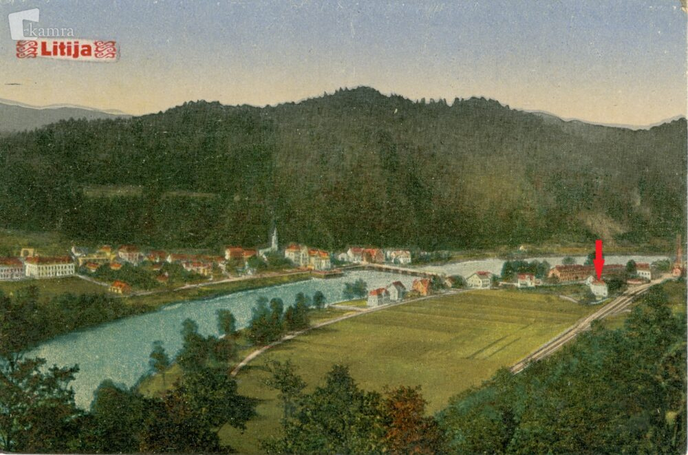 Z rdečo puščico je označena nekdanja zgradba Okrajnega glavarstva v Litiji, ki je kasneje postala Knjižnica Litija. Stavba je pomemben del mestne zgodovine, saj je skozi čas dobila nove vloge, danes pa jo mnogi domačini prepoznajo kot enega izmed osrednjih kulturnih prostorov v mestu.