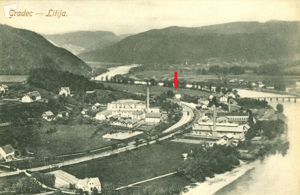 Z rdečo puščico je označena nekdanja zgradba Okrajnega glavarstva v Litiji, ki je kasneje postala Knjižnica Litija. Stavba je pomemben del mestne zgodovine, saj je skozi čas dobila nove vloge, danes pa jo mnogi domačini prepoznajo kot enega izmed osrednjih kulturnih prostorov v mestu.