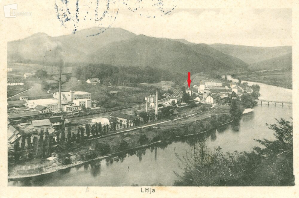 Z rdečo puščico je označena nekdanja zgradba Okrajnega glavarstva v Litiji, ki je kasneje postala Knjižnica Litija. Stavba je pomemben del mestne zgodovine, saj je skozi čas dobila nove vloge, danes pa jo mnogi domačini prepoznajo kot enega izmed osrednjih kulturnih prostorov v mestu.