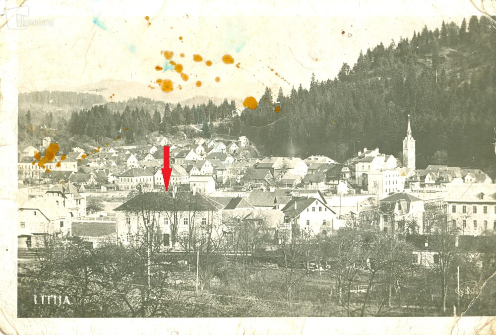 Z rdečo puščico je označena nekdanja zgradba Okrajnega glavarstva v Litiji, ki je kasneje postala Knjižnica Litija. Stavba je pomemben del mestne zgodovine, saj je skozi čas dobila nove vloge, danes pa jo mnogi domačini prepoznajo kot enega izmed osrednjih kulturnih prostorov v mestu.