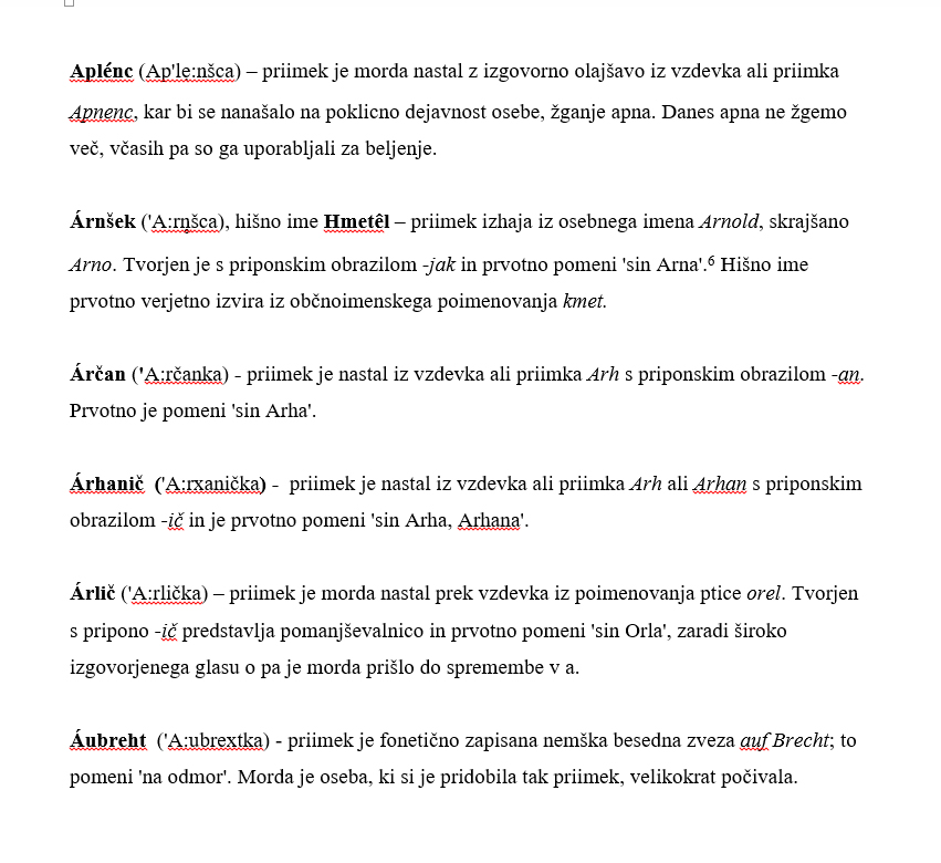 Priimki imajo v oklepajih dodano jezikoslovno fonetično zapisano žensko obliko priimka, ponekod pa so zraven tudi hišna imena.