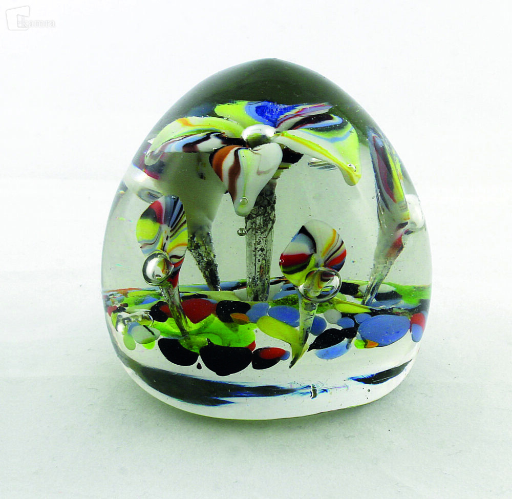 Hrastnik (1939 – 1950). Manjši kroglast obtežilnik s povišano, skoraj konično kupolo. Štirilistni središčni cvet je iz prelivajočega belega, modrega, rumenega, rdečega in rjavega stekla. Mehurček v sredini prehaja v debel cvetni pecelj. Obdajajo ga štirje manjši, enako obarvani cvetovi z ekscentrično postavljenimi mehurčki na zunanji strani cvetov. Blazina, ki je iz pisanih koščkov povsem raztaljenega stekla, je na stiku s cvetnimi stebli upognjena proti bazi obtežilnika. Baza je široka, ravna in brušena. V = 71 mm,Š = 72 mm.