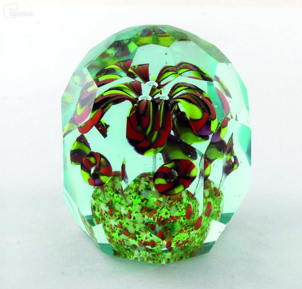 Avstrija (1900 – 1930). Miniaturni jajčasto oblikovan obtežilnik s petimi nivoji fasetnih polj. Pisan osrednji motiv je rumeno-rdeče-rjav petlistni cvet obkrožen s petimi enako obarvanimi majhnimi čašastimi cvetlicami. Raznobarvna podlaga ima obliko povišane blazine. osemkotna baza je ravna in polirana. V = 63 mm, Š = 57 mm.
