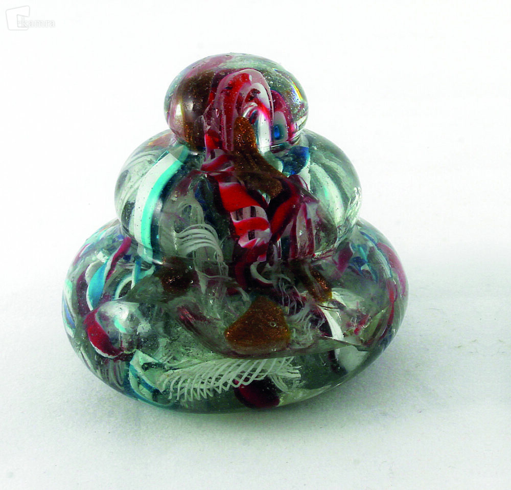 Italija / Murano (1845 – 1870). Redek miniaturni obtežilnik v obliki tristopenjskega stožca z umešano dekoracijo, ki sestoji iz raznobarvnih in belih filigranskih zvitkov, koščkov barvnih steklenih trakov in avanturinskega stekla. Ne vsebuje paličic millefiori stekla. Dekoracija je blizu površine obtežilnika. Baza je konkavna ,z vidnim odlomom od steklarske palice. V = 60 mm, Š = 64 mm.